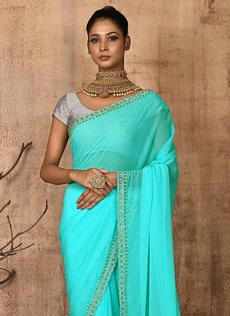 Arctic Blue Georgette Hand Work Saree Party Wear