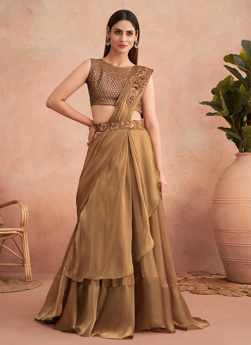 Beige Chinon Silk Embroidered Ready Pleated Saree Party Wear