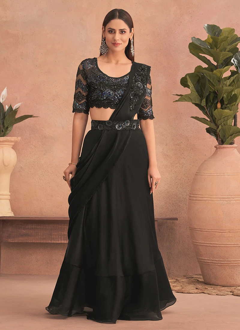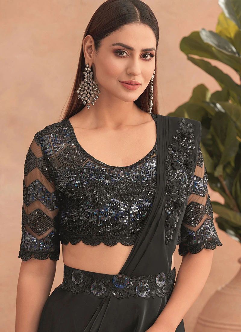 Black Chinon Silk Embroidered Ready Pleated Saree Party Wear