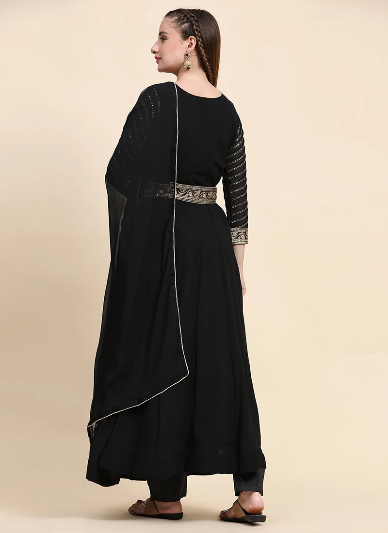The dupatta accompanying the Anarkali suit complements the kurta beautifully. It is crafted from sheer georgette fabric and is adorned with matching embroidery enhancing its overall allure. The dupatta can be draped in various styles adding versatility to the outfit and allowing you to experiment with different looks. Embrace the charm of this ensemble and revel in the compliments that come your way as you dazzle in this exquisite black Anarkali suit.