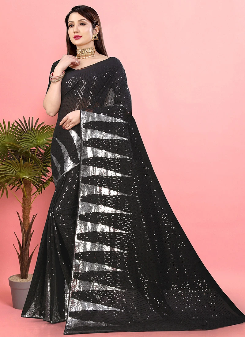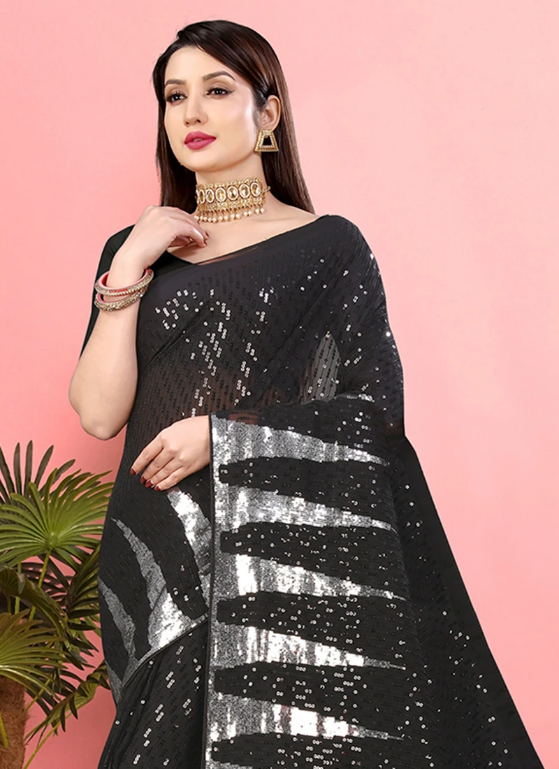 Black Georgette Sequins Embroidered Work Saree Party Wear