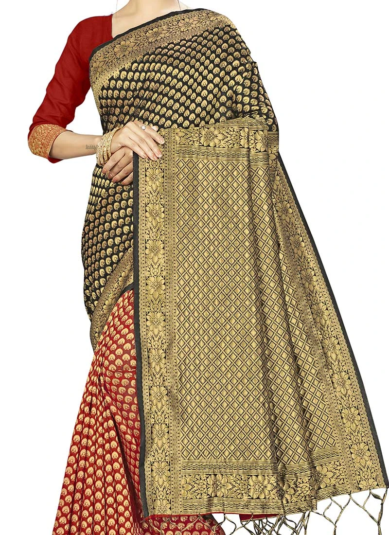 Black N Red Banarasi Silk Zari Work Saree Festive Wear