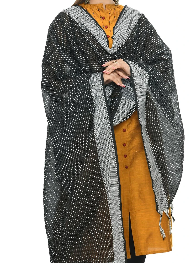 Black N White Dot Handloom Cotton Weaving Work Dupatta Work Wear