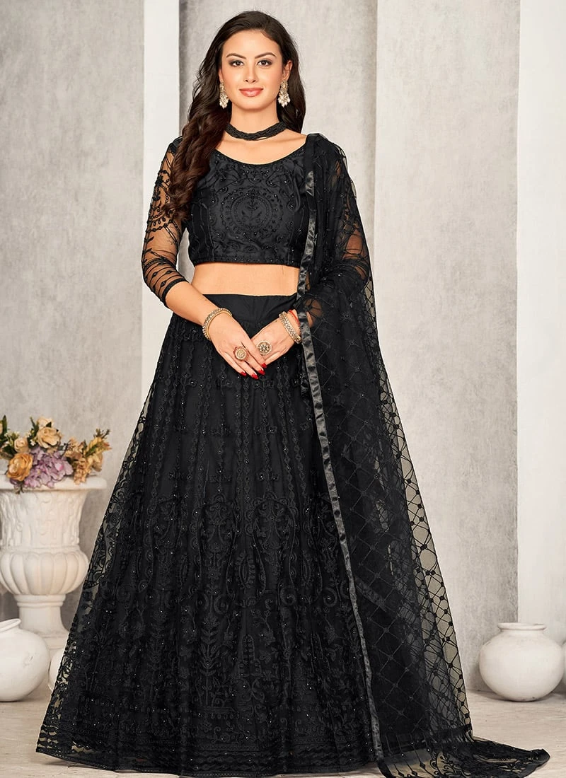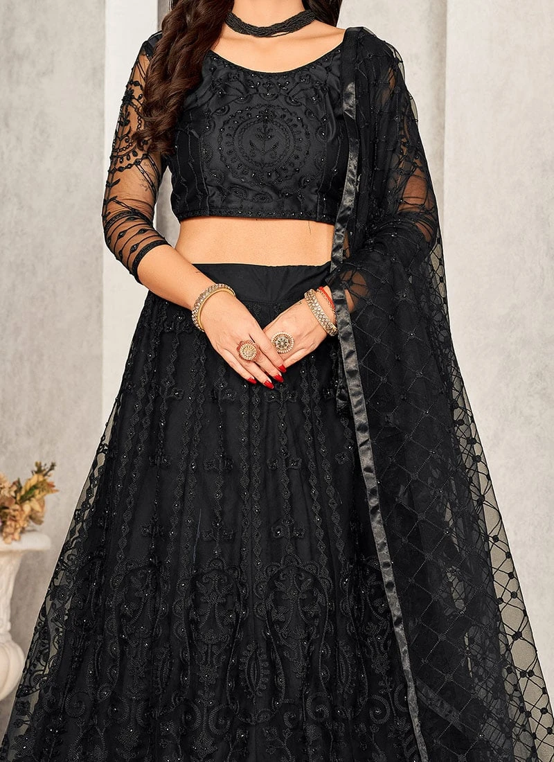 The lehenga crafted from luxurious black net fabric exudes a sense of sophistication and grace. The net material adds a touch of delicacy and sheer beauty to the ensemble creating a mesmerizing effect as it drapes elegantly around the wearer. The rich black hue serves as a canvas for intricate and elaborate embroidery elevating the lehenga to a piece of wearable art.