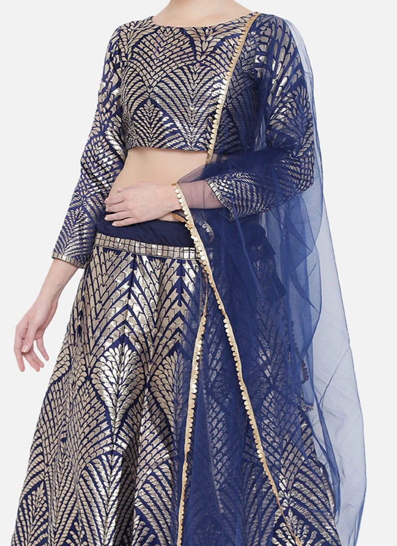 This Blue Art Silk Gota A Line Lehenga is a true work of art that captures the essence of Indian tradition while embracing modern aesthetics. It is a testament to the skill of the artisans who have created it and it promises to make any woman feel like royalty when she wears it. With its rich blue colour intricate Gota work and flattering silhouette this lehenga is a statement piece that will leave a lasting impression at any special occasion. It embodies the beauty grace and timeless charm of Indian fashion making it a musthave addition to any discerning womans wardrobe.
