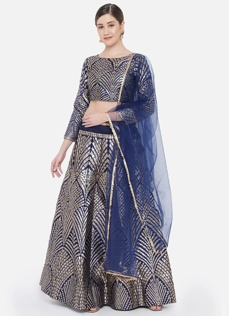 The lehenga features a mesmerizing shade of royal blue that exudes regal charm and sophistication. This rich hue is known for its ability to complement a wide range of skin tones making it a universally flattering choice for women of all backgrounds. The deep blue colour is also symbolic of depth wisdom and trust adding a sense of meaning to the attire.