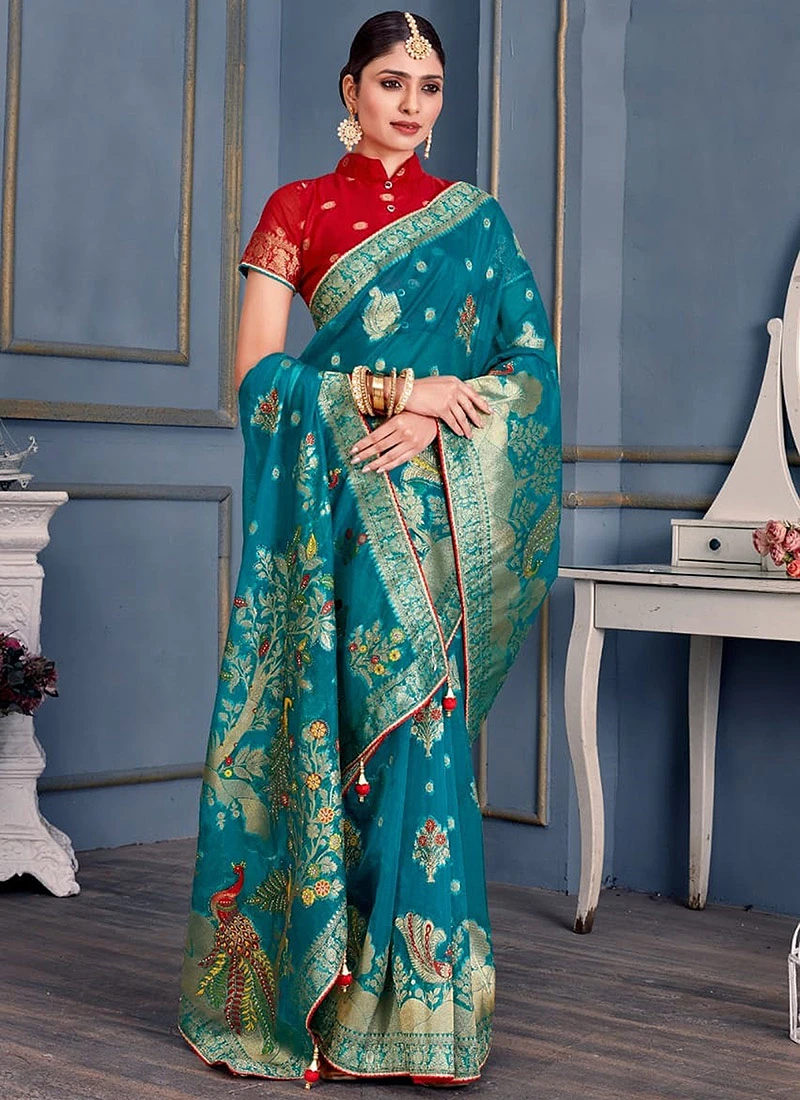 This saree is not just a piece of clothing it is a work of art that reflects the rich cultural heritage of India. It embodies the perfect blend of traditional craftsmanship and contemporary design making it a timeless addition to any womans wardrobe. Whether worn at weddings parties or cultural events the Blue Art Silk Zari Saree is sure to leave a lasting impression turning heads and eliciting admiration wherever you go. Elevate your style and embrace the timeless beauty of this exquisite saree and let its allure captivate the hearts of onlookers making you the epitome of grace and elegance.