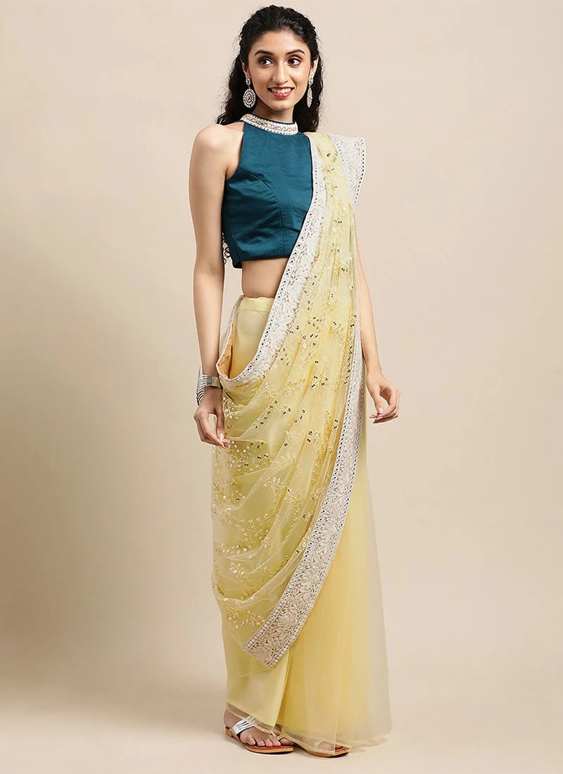 Blue N Yellow Embroidered Half N Half Saree Party Wear