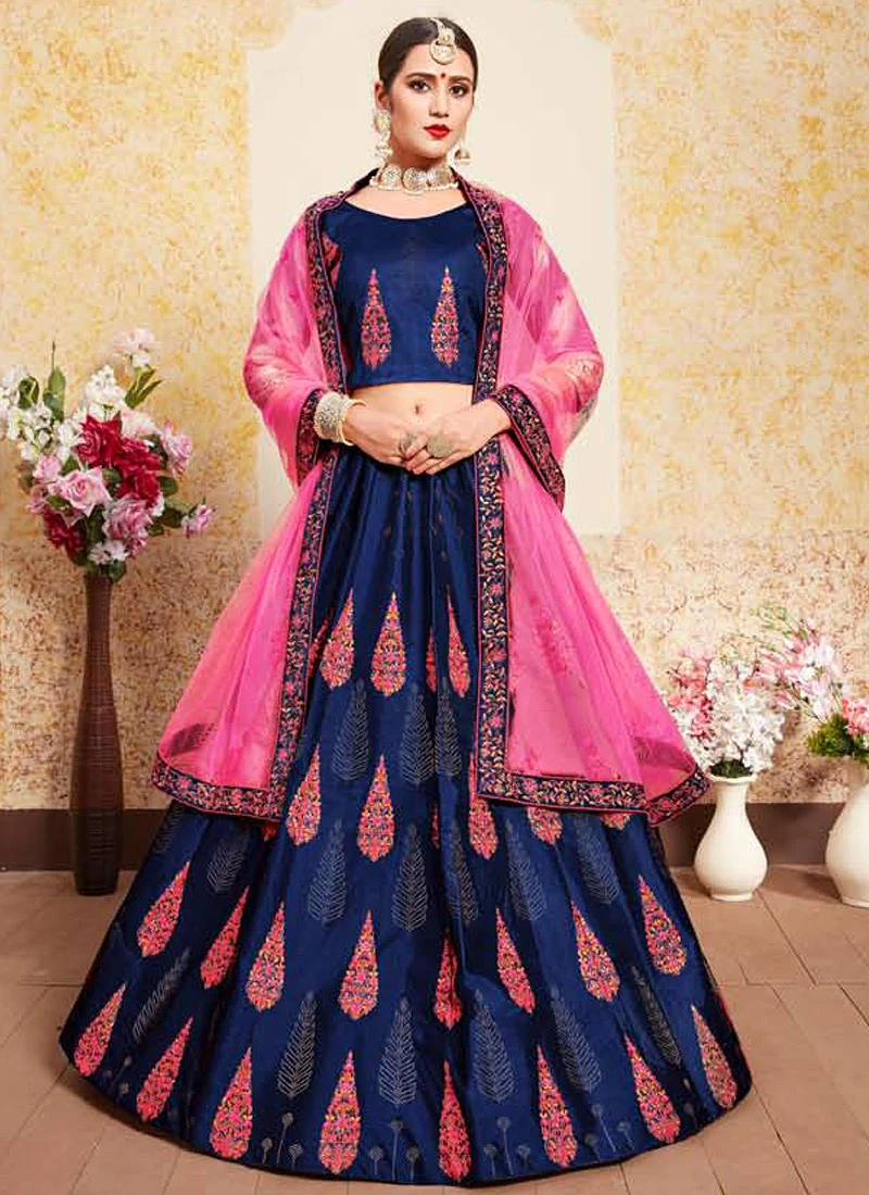 Blue Satin Embroidered Umbrella Lehenga Wedding Wear