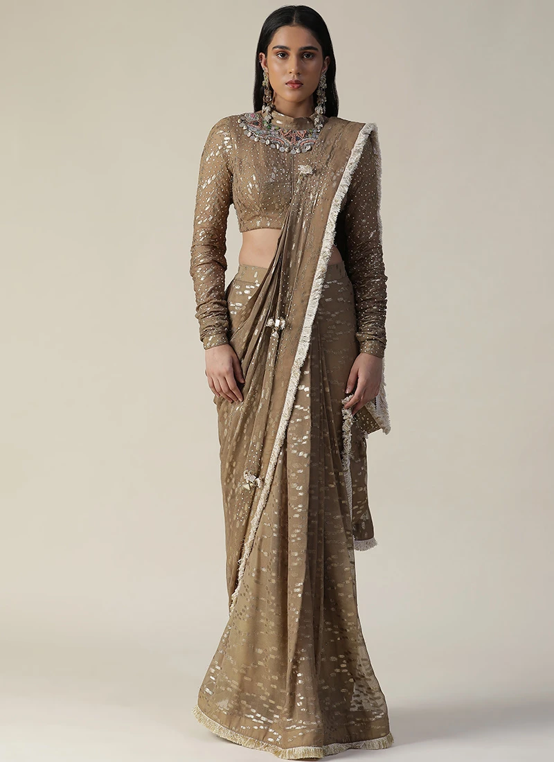 Whether youre attending a wedding a festive celebration or any special event this tan colour predraped georgette saree with a chudidar sleeve blouse is the epitome of timeless beauty. It effortlessly captures the essence of traditional Indian attire while embracing modern design elements.
