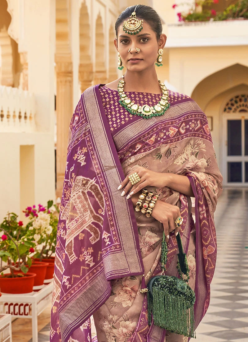 Chiku Beige Color Printed Chiffon Silk Saree Festive Wear