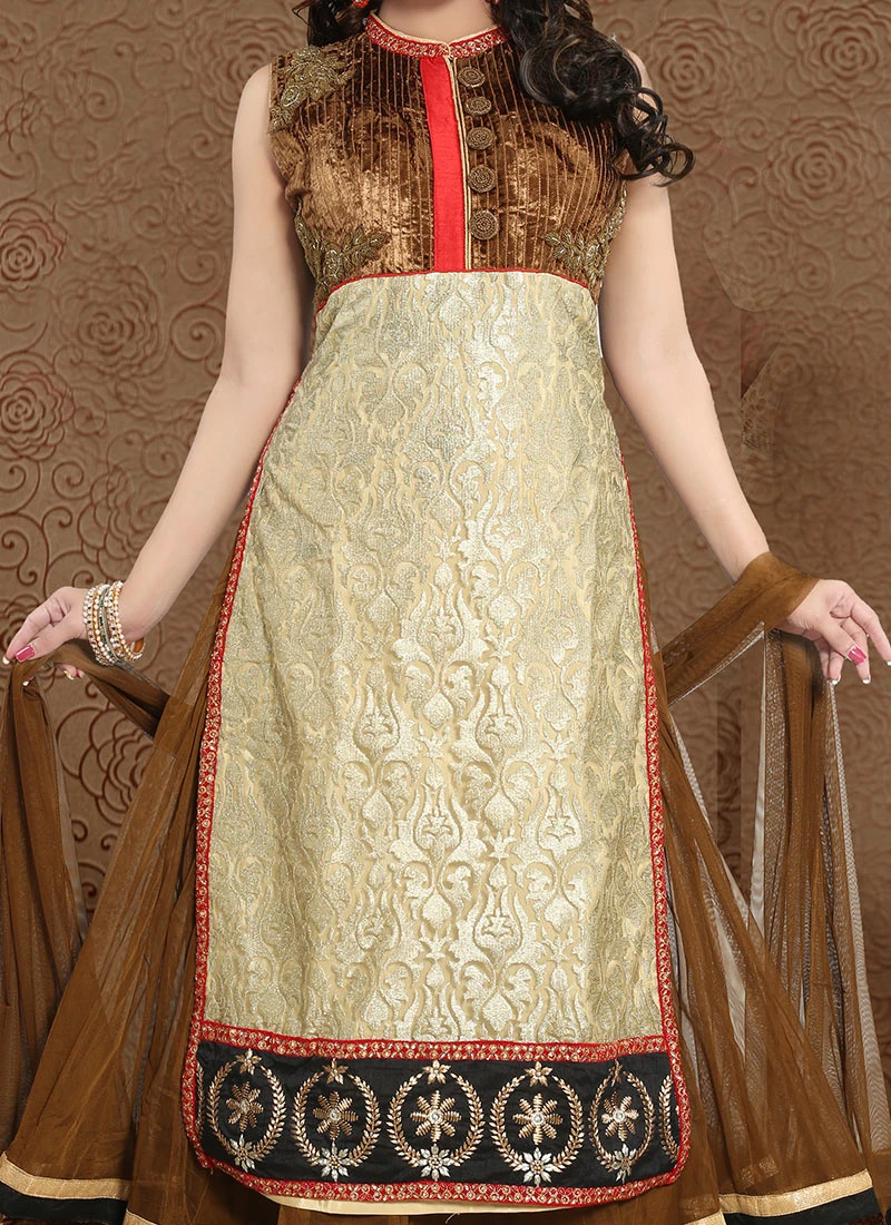 The Anarkali suit takes its inspiration from the Mughal era characterized by its floorlength flared silhouette that gracefully drapes the wearer in layers of flowing fabric. The choice of coffee net as the primary material adds a touch of modernity to the classic design creating a captivating visual appeal. The net fabric allows for a subtle translucency enhancing the overall allure of the attire.