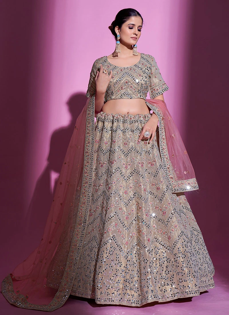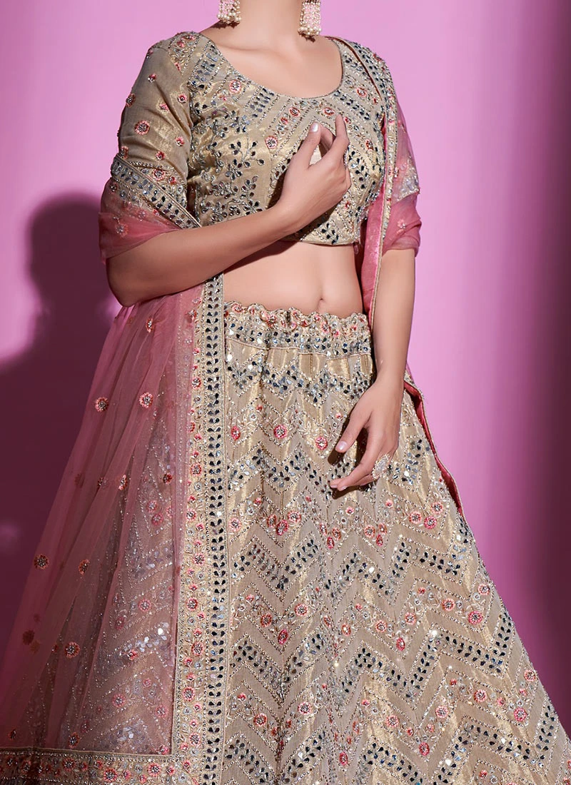 Cream Beige Art Silk Thread N Sequins Umbrella Lehenga Wedding Wear