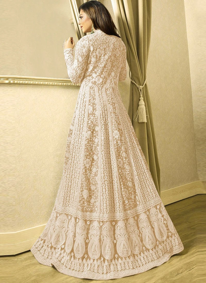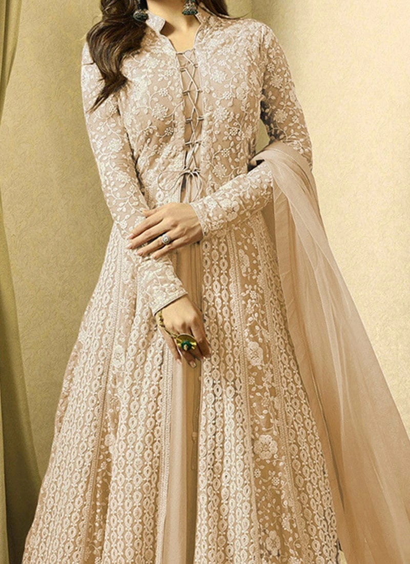 Drashti Dhami Beige Embroidered Anarkali Suit Party Wear