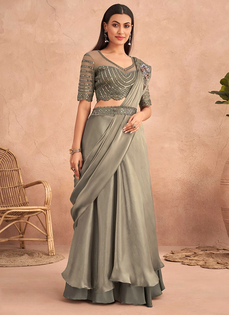 Dusty Green Chinon Silk Ready Pleated Saree Party Wear