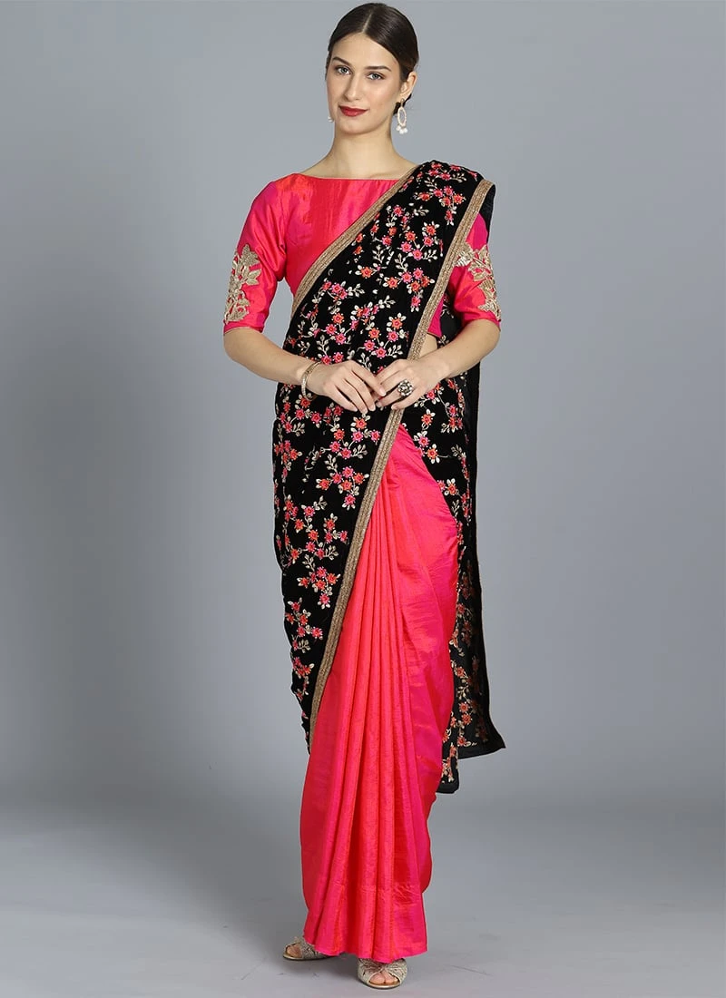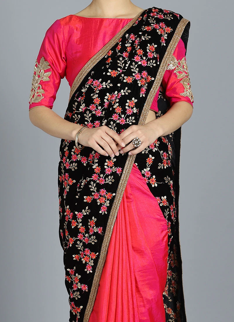 The pallu part is of embroidered black velvet fabric adorned with stunning lace is paired up with pink soft silk saree..