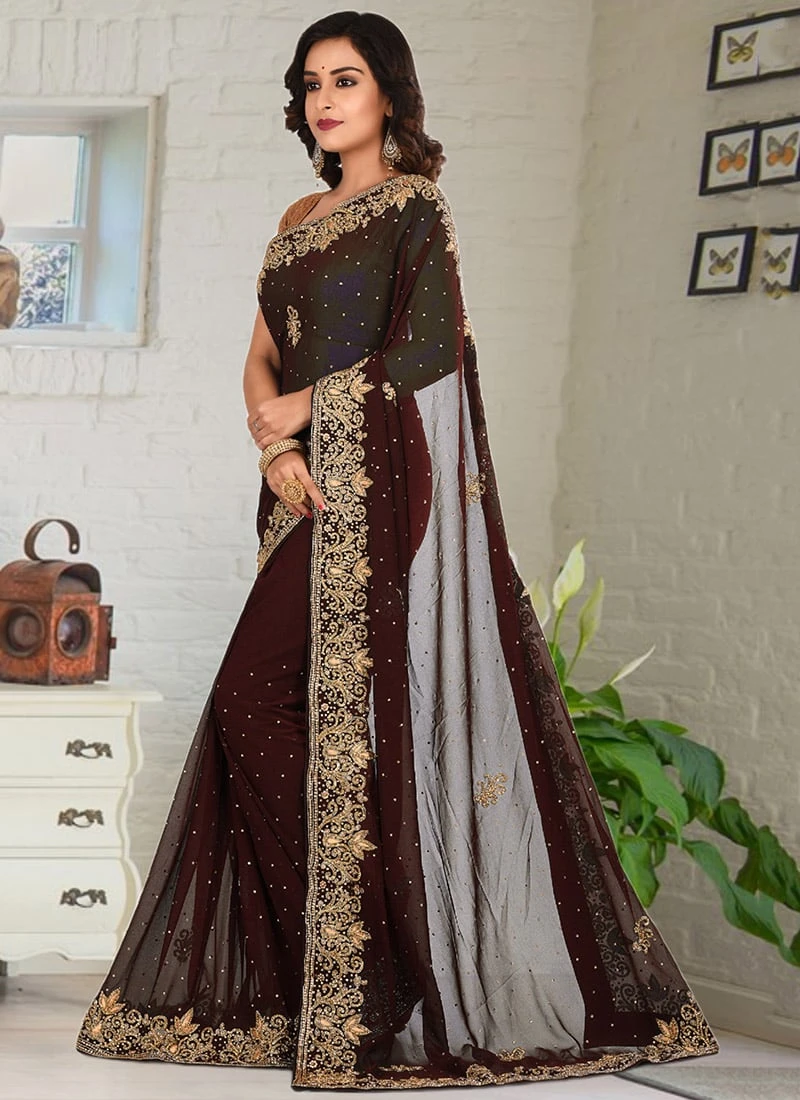Georgette Coffee Brown Color Hand Embroidered Stone Work Saree Party Wear