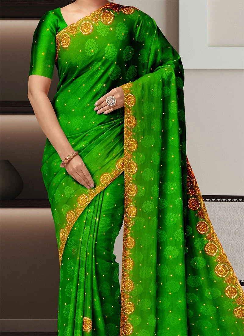 The saree is made from highquality art silk a synthetic fabric that closely resembles the texture and feel of pure silk. Art silk is known for its smoothness and lustrous appearance making it a popular choice for sarees. The vibrant green colour of this saree adds a touch of freshness and grace making it perfect for various occasions such as weddings parties and festivals.