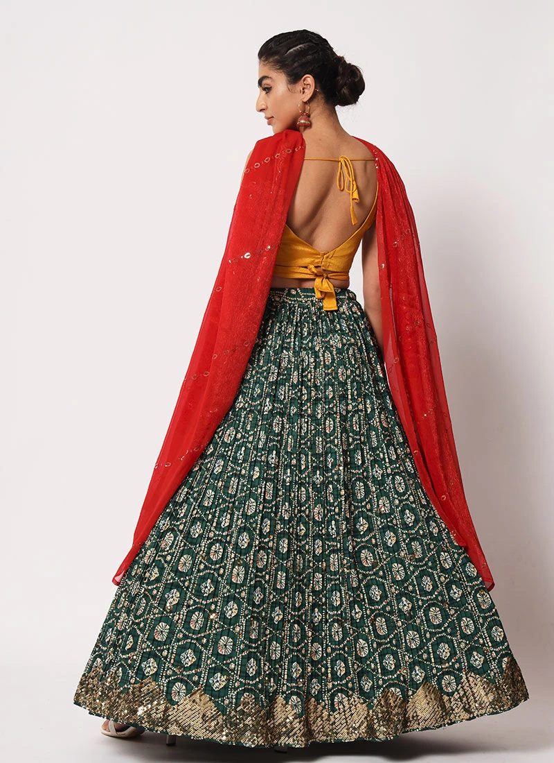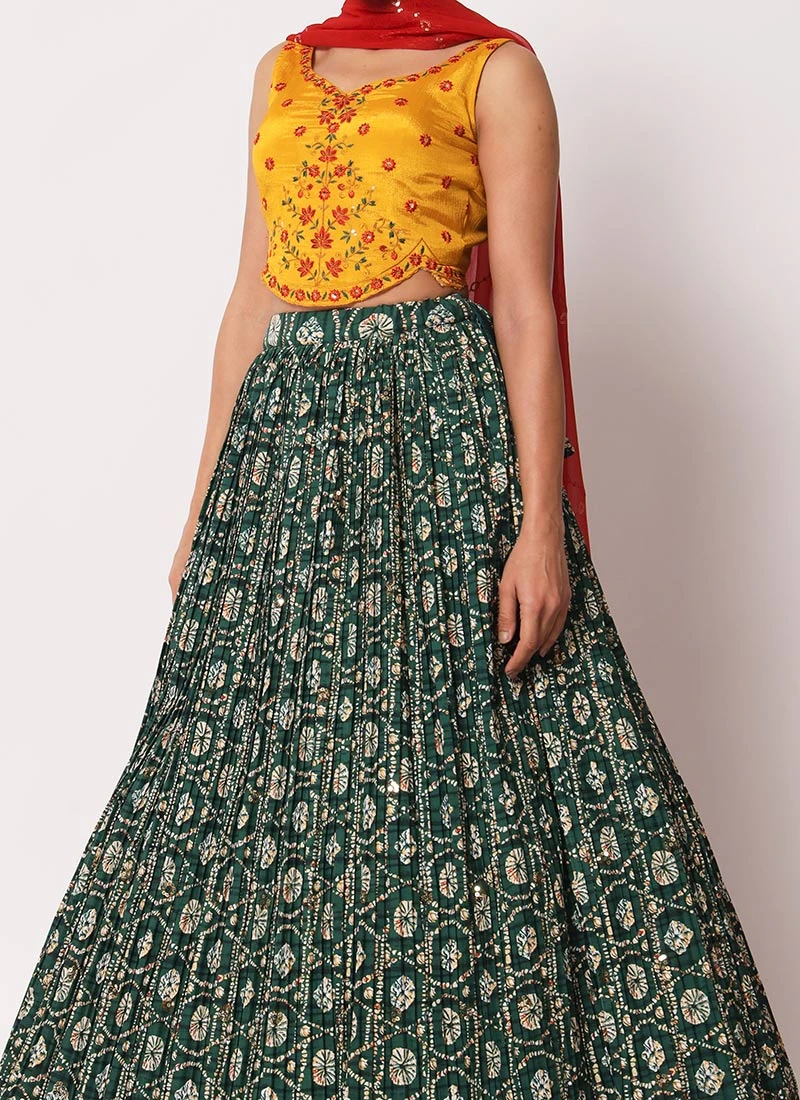 Comes with semi -stitched lehenga, un stitched choli and dupatta fabric. To have it stitched, please select the custom tailoring options. Lehenga with elaborate patterns and colors are used for photo-shoot. Color and pattern of the lehenga might not be as shown in the image.