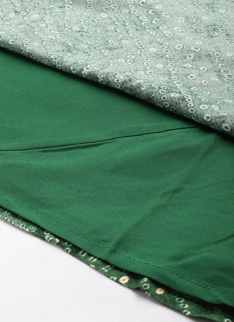 Green Bandhani Printed Rayon Strap Neck Dress Festive Wear