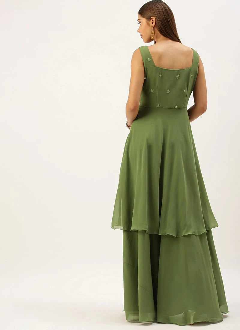 Green Embroidered Georgette Layered Gown Festive Wear