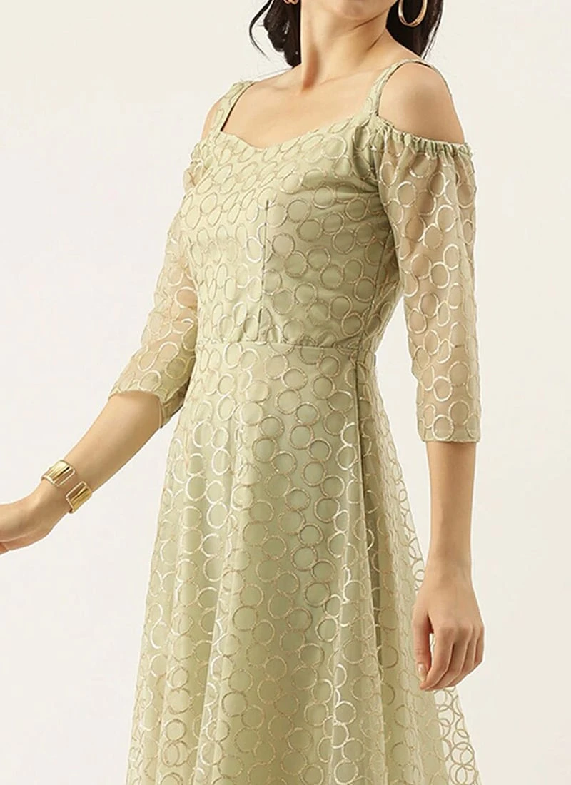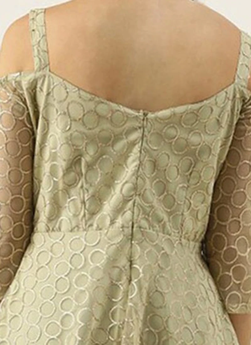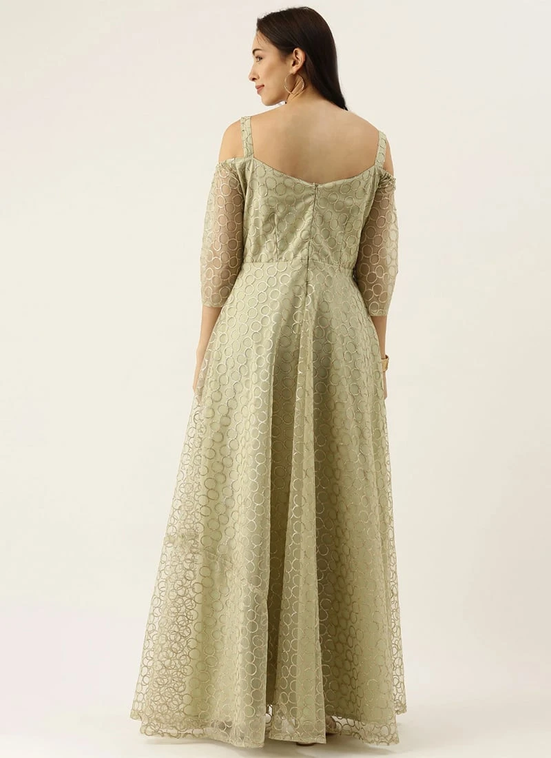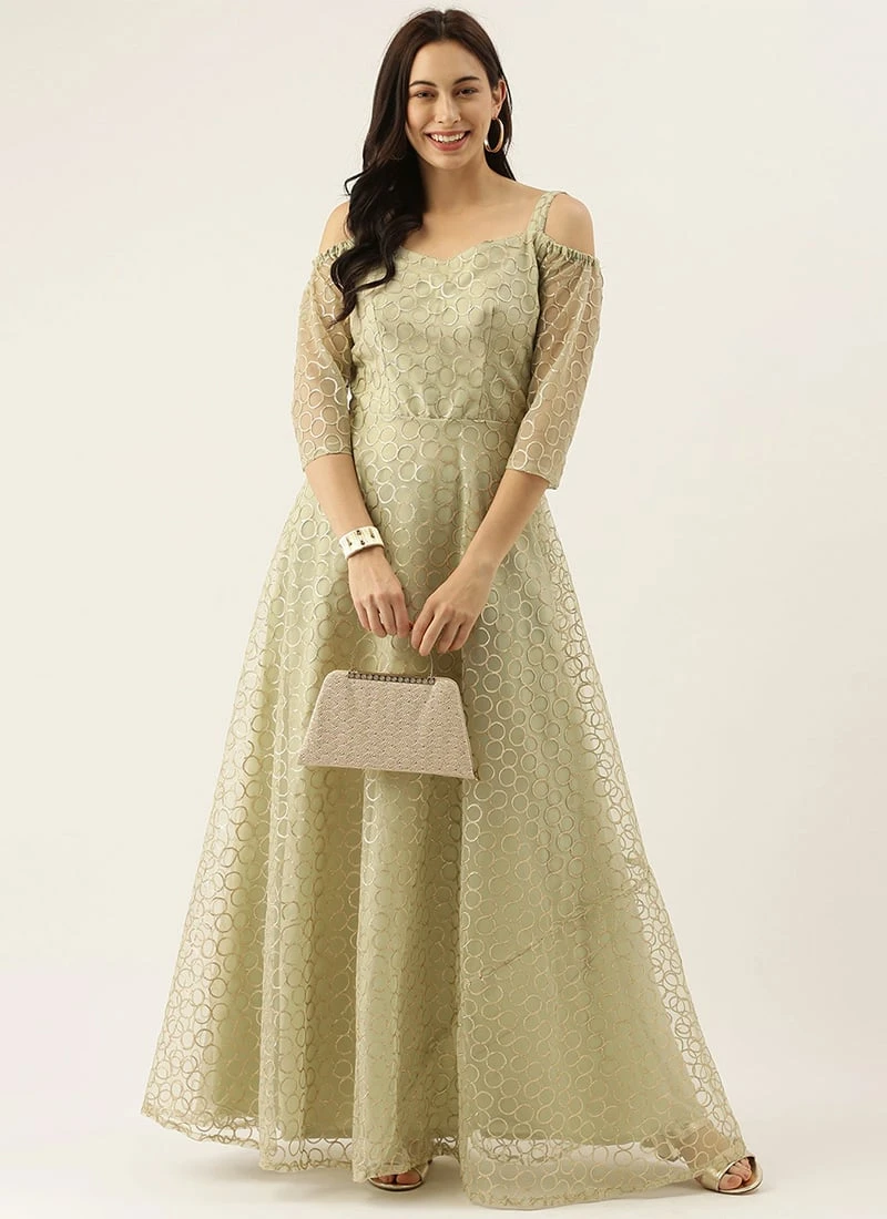 Presenting a green net embroidered floor-length gown, features off shoulder style v neckline with strap both in front and back, sheer three-fourth sleeves, yoke until natural waist-length, has half-circular flare, comes with back zip opening. Mask only for shoot purposes.Refer the fabric image for true color of the dress. This dress is custom designed from fabric and custom stitched. Once sold cannot be returned.Designs, colors, and patterns on the actual product may slightly vary from designs shown in the image. Images are the only representative