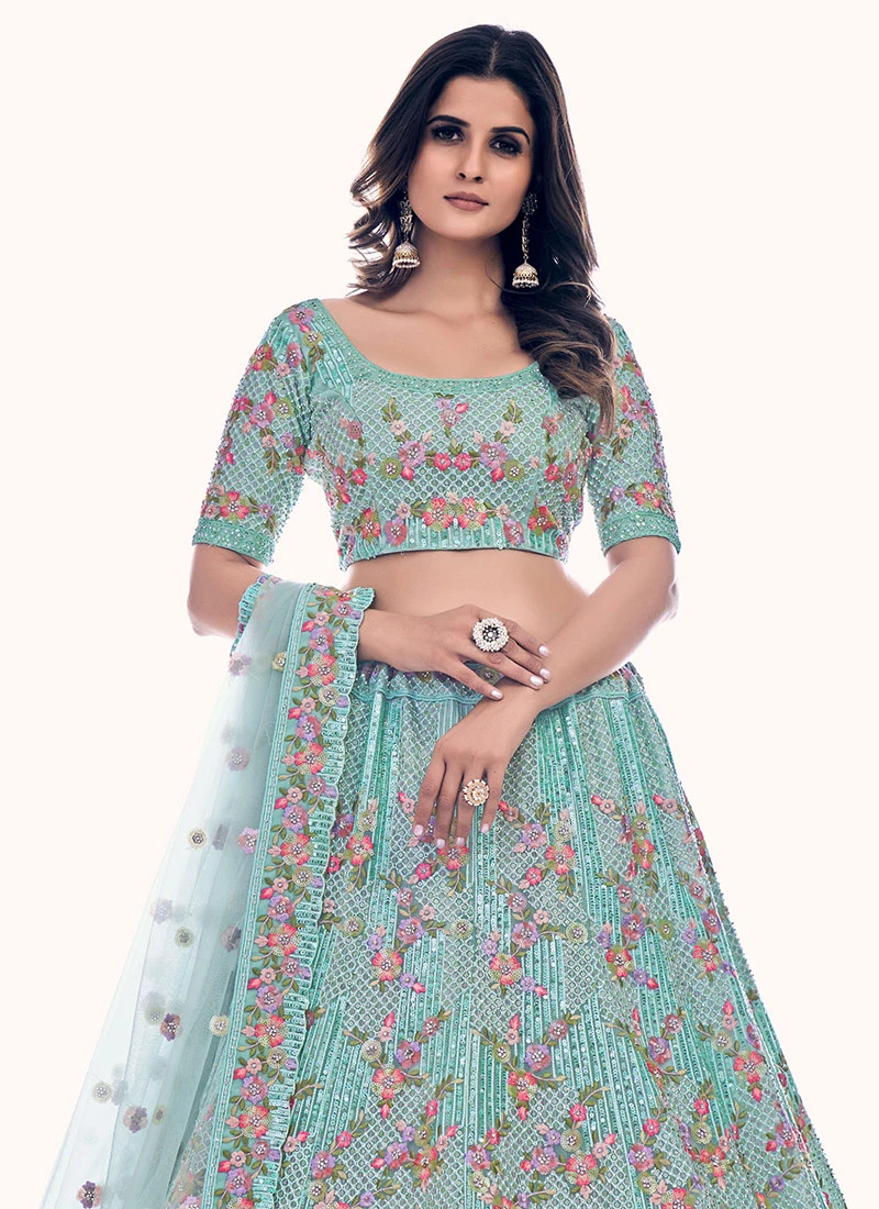 Green Net Thread N Sequins Work Umbrella Lehenga Wedding Wear