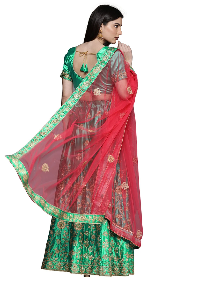 Green Satin Silk Embroidered A Line Lehenga Festive Wear