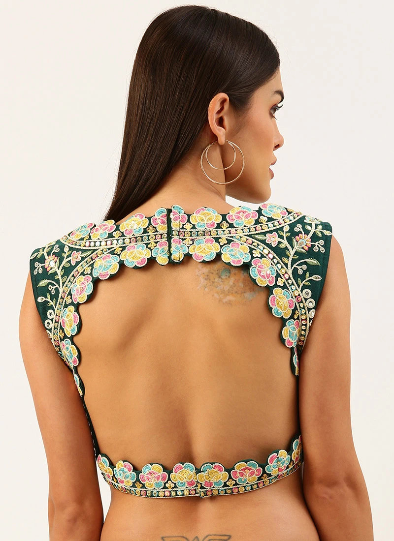 Presenting a green color silk readymade blouse beautified with mirror embroidery and sequins work and crafted with boat neck and sleeveless with back hook.