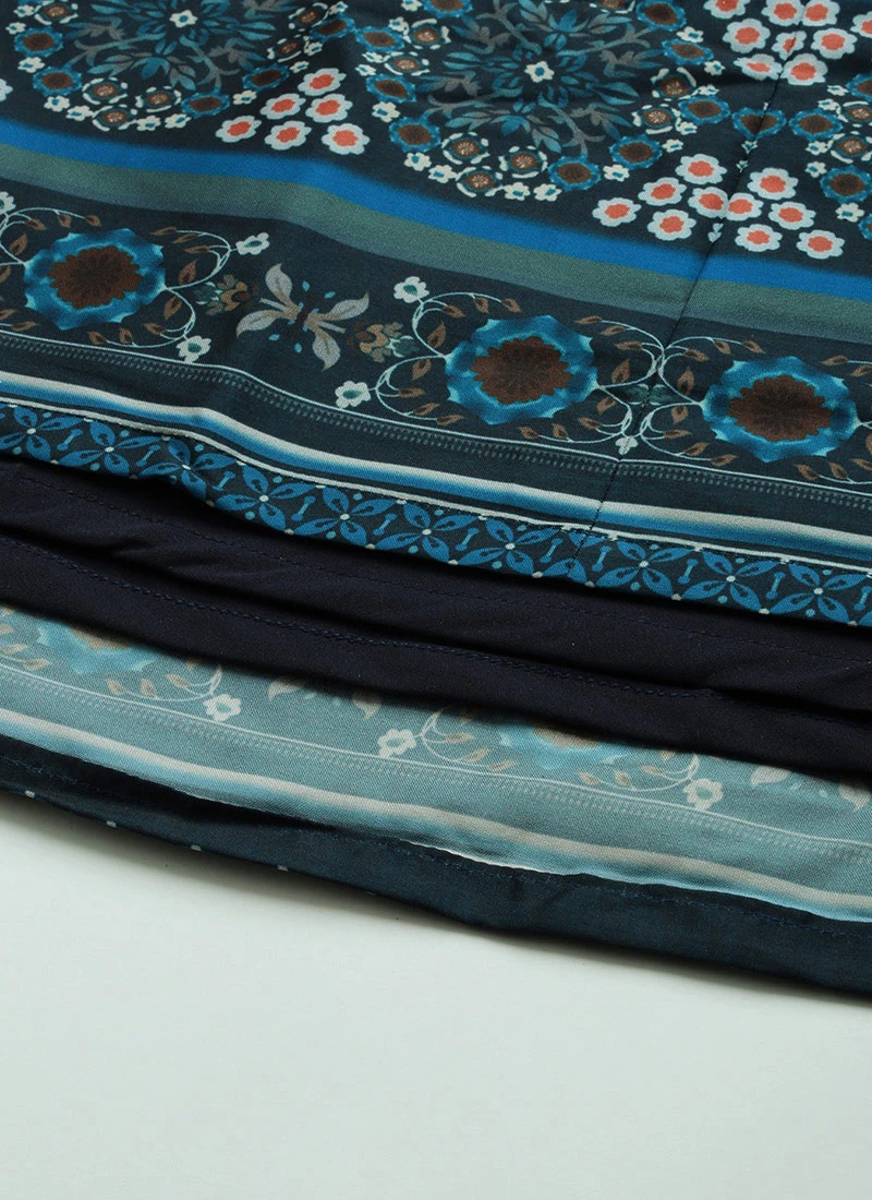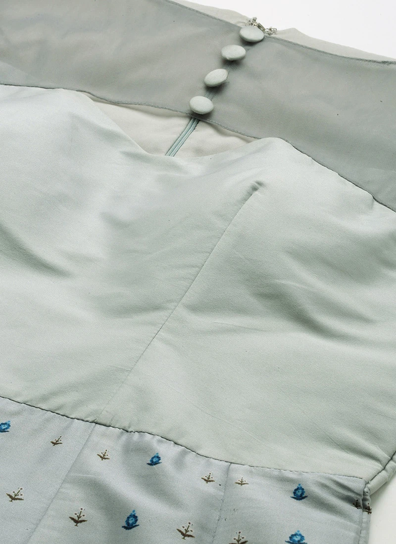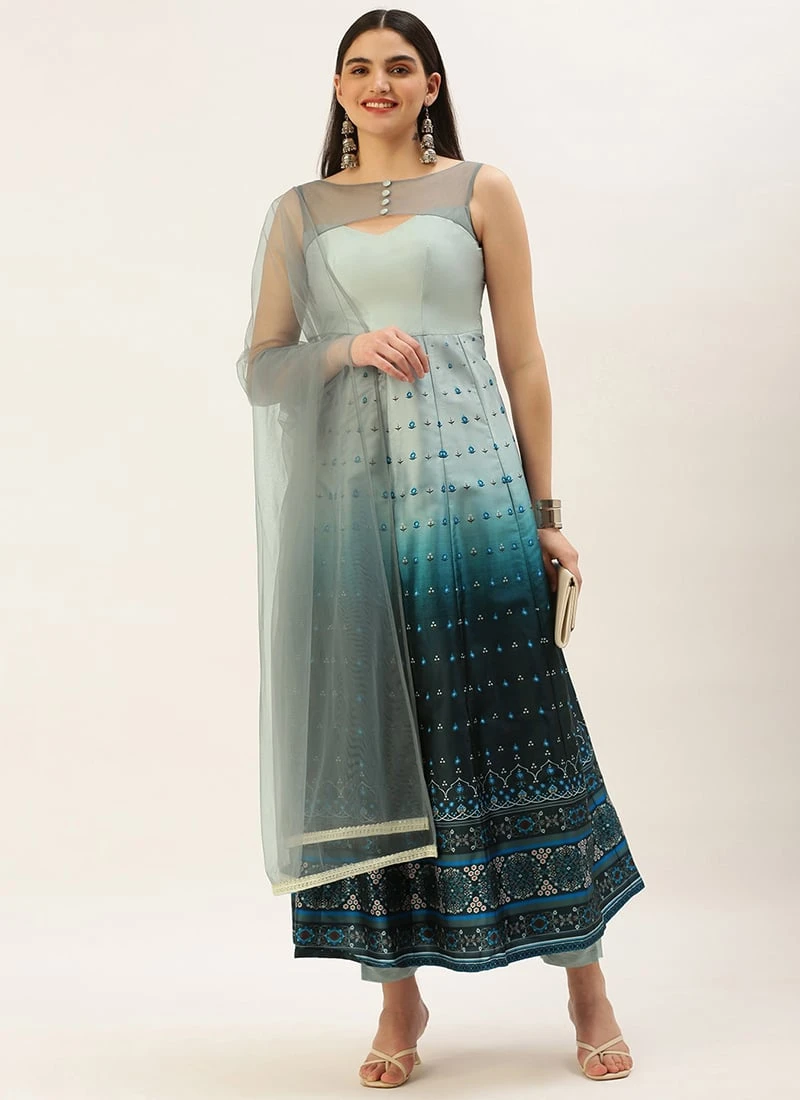 Grey N Blue Taffeta Printed Anarkali Suit Festive Wear