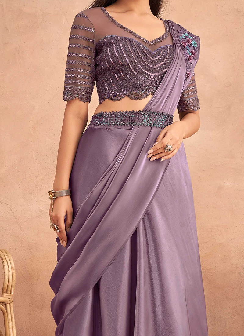 Lavender Chinon Silk Ready Pleated Saree Party Wear