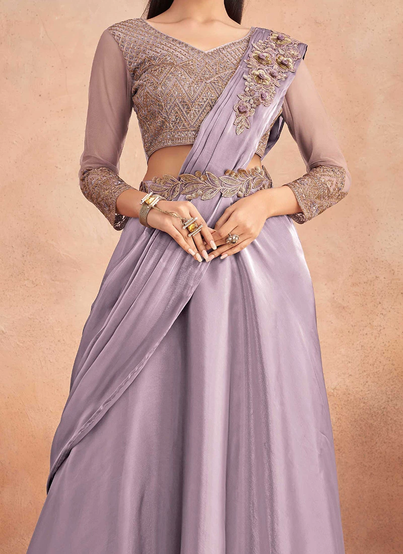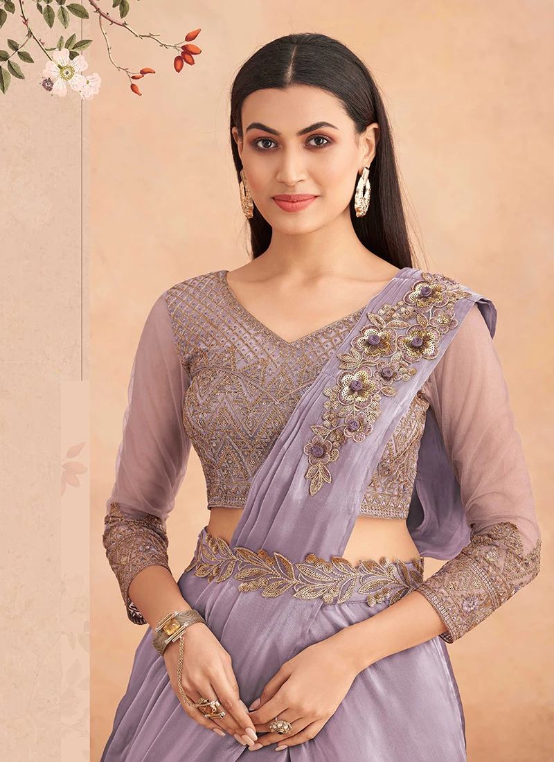Lavender Chinon Silk Sequins Embroidered Ready Pleated Saree Party Wear