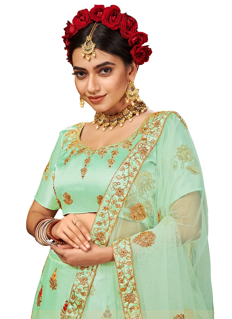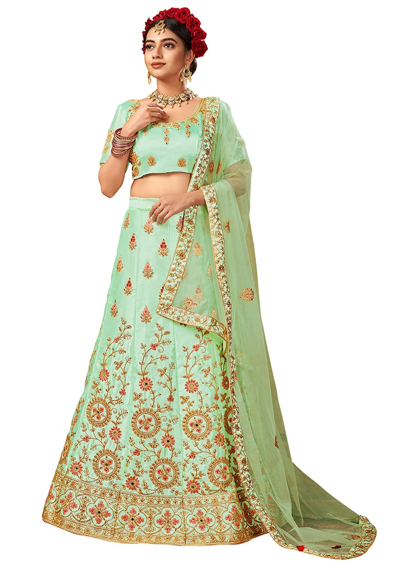 Light Green Satin Silk Machine Embroidered A Line Lehenga Party Wear