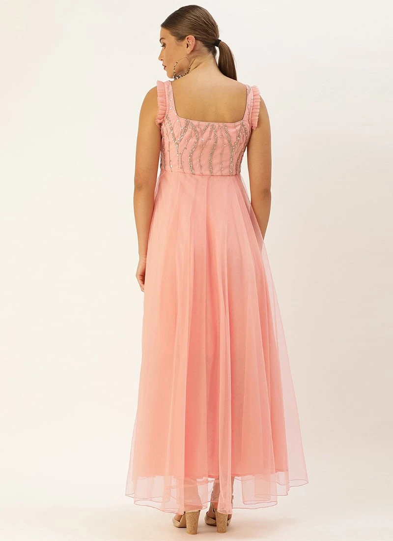 Presenting light pink embroidered gown till knee to ankle length, feature strap neck in front and and back, side zipper opening, light pink embroidered yoke comes until under bust, light pink net full flare till knee to ankle. Mask only for shoot purposes.Refer the fabric image for true color of the dress. This dress is custom designed from fabric and custom stitched. Once sold cannot be returned.Designs, colors, and patterns on the actual product may slightly vary from designs shown in the image. Images are the only representative