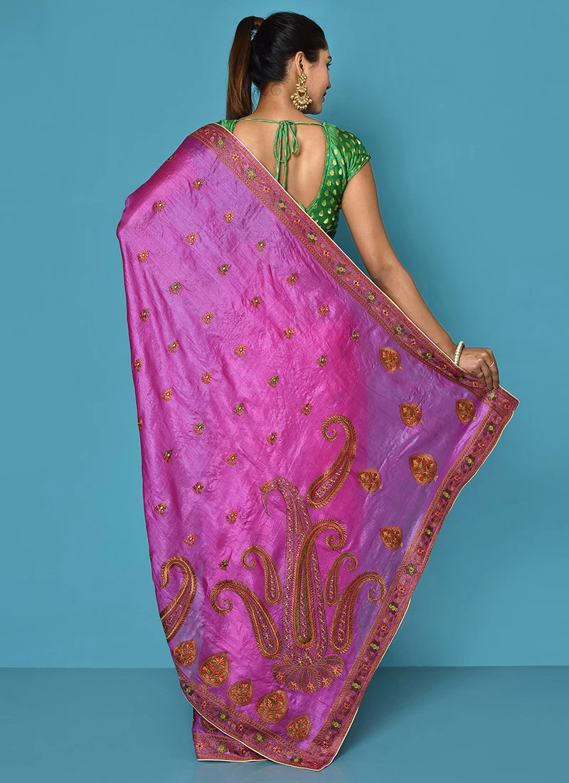Magenta Color Embroidery Work Pure Silk Tussar Silk Saree Festive Wear