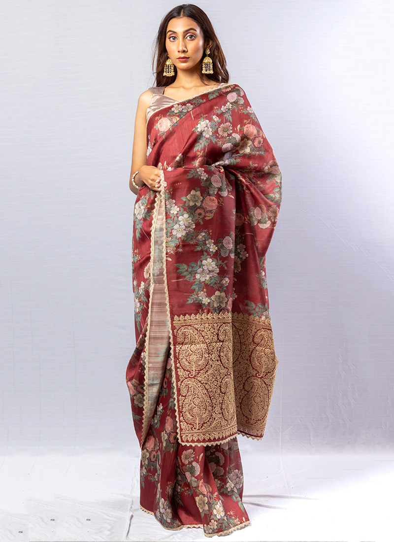 Comes with unstitched blouse fabric. To have the blouse stitched, please select the custom tailoring options. Blouses with elaborate patterns and colors are used for photo-shoot. Color and pattern of the blouse might not be as shown in the image.