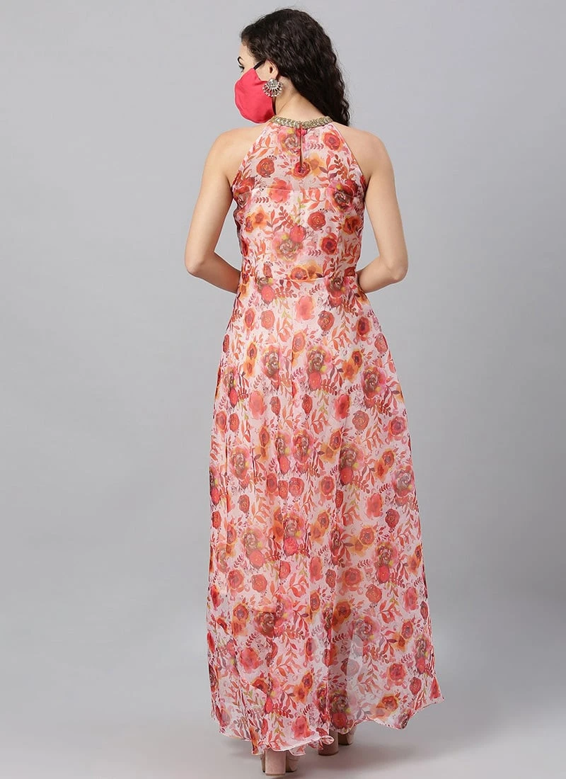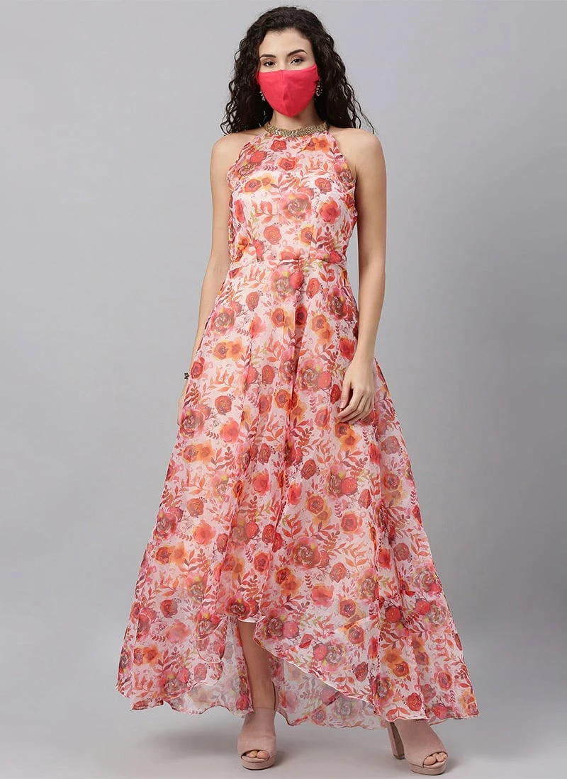 Presenting a multicolored printed organza asymmetrical dress, which has high halter neckline at front and back with embellished border, sleeveless, side zipper closure, yoke till natural waist length, below natural waist has high and low asymmetrical minimum flare highest length calf length and lowest length till ankle length and lining till knee length, Mask only for shoot purposes.Refer the fabric image for true color of the dress. This dress is custom designed from fabric and custom stitched. Once sold cannot be returned.Designs, colors, and patterns on the actual product may slightly vary from designs shown in the image. Images are the only representative