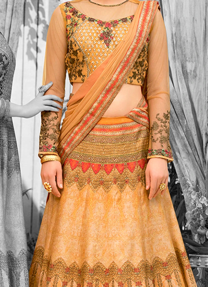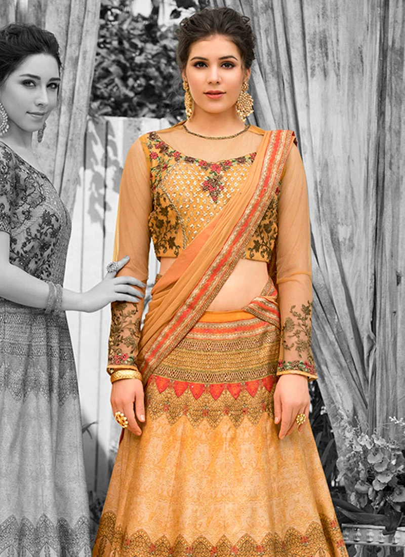Comes with unstitched lehenga, choli and dupatta fabric. To have it stitched, please select the custom tailoring options. Lehenga with elaborate patterns and colors are used for photo-shoot. Color and pattern of the lehenga might not be as shown in the image.