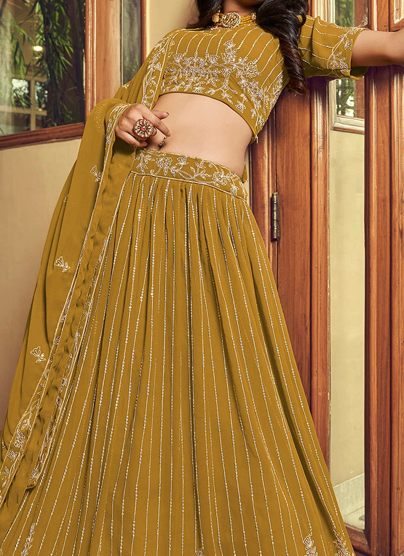 Mustard Georgette Embroidered N Sequins Umbrella Lehenga Party Wear