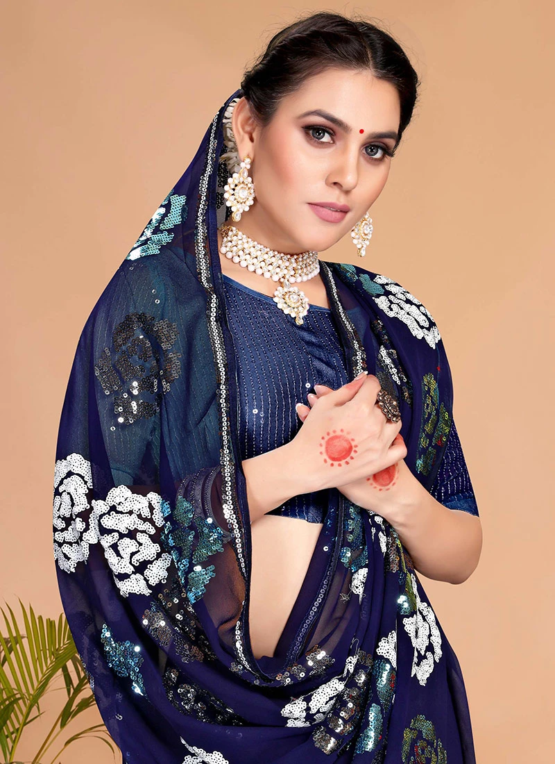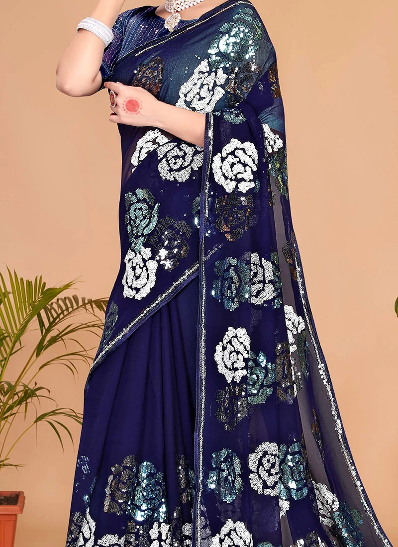 Navy Blue Georgette Sequins Embroidery Work Saree Party Wear