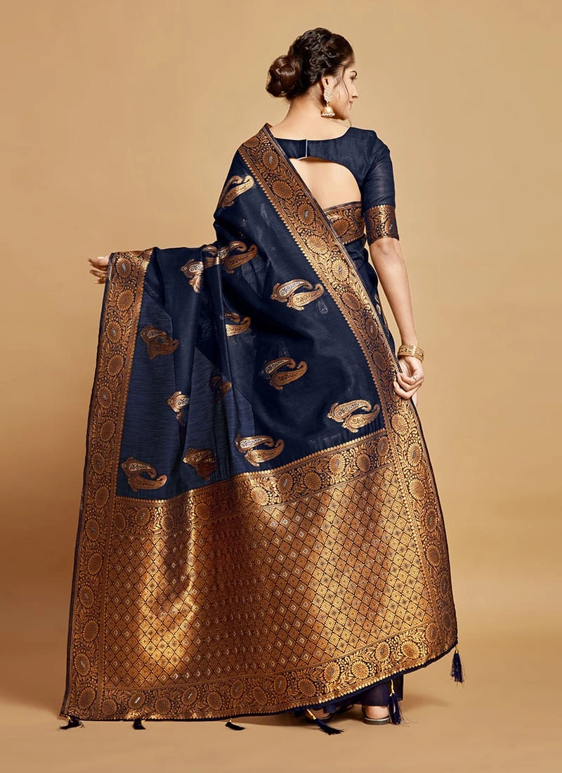 Navy Blue Linen Weaving Work Saree Festive Wear