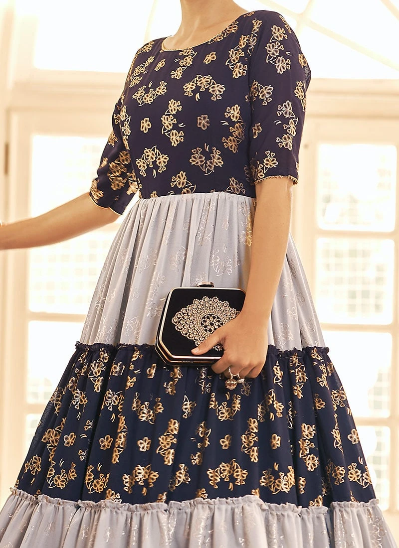 Navy Blue N White Georgette Foil Printed Anarkali Gown After Six Wear