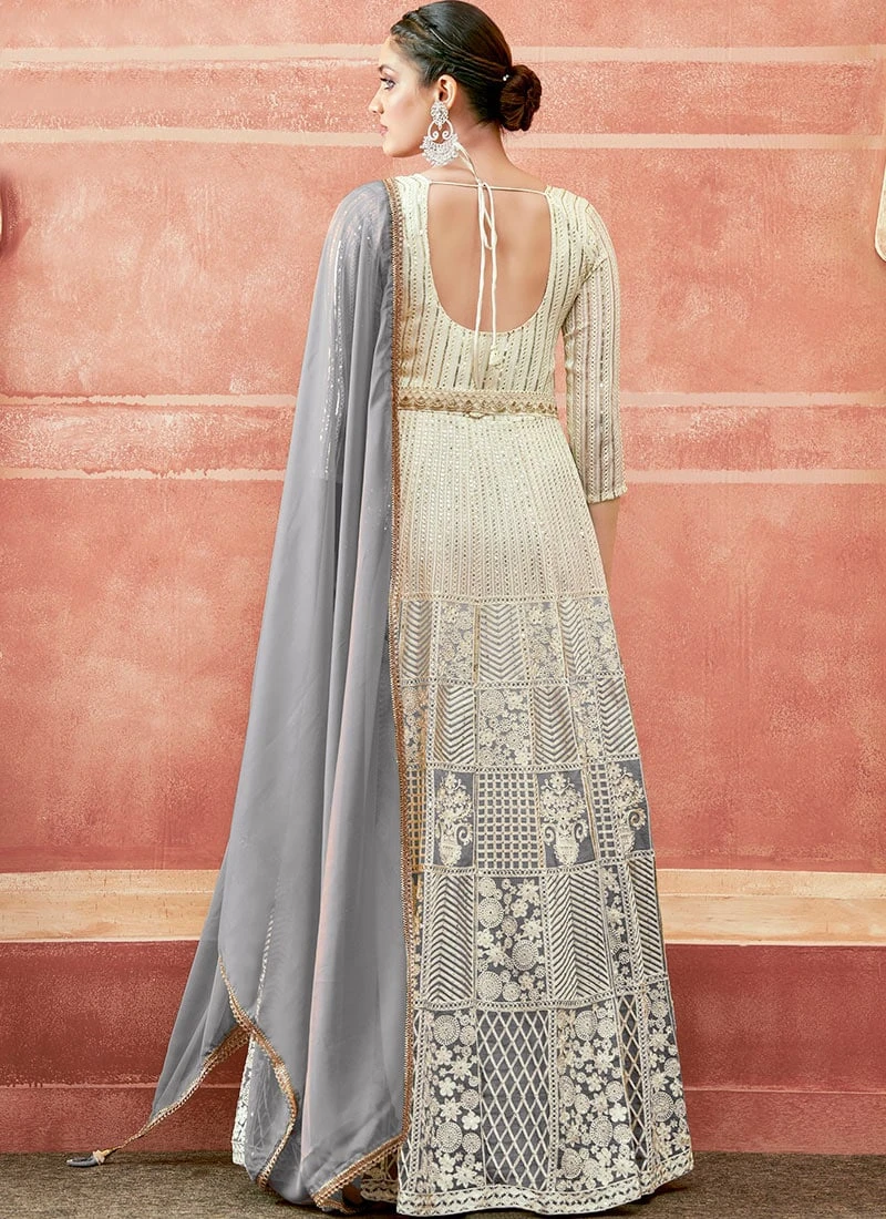 In essence, the Off White and Gray Faux Georgette Embroidered Dresses and Gown are not just garments they are expressions of artistry and style. They embody the essence of modern femininity, combining tradition with contemporary trends seamlessly. When you wear these outfits, you dont just wear clothes you wear confidence, grace, and a touch of allure, making a lasting impression wherever you go.