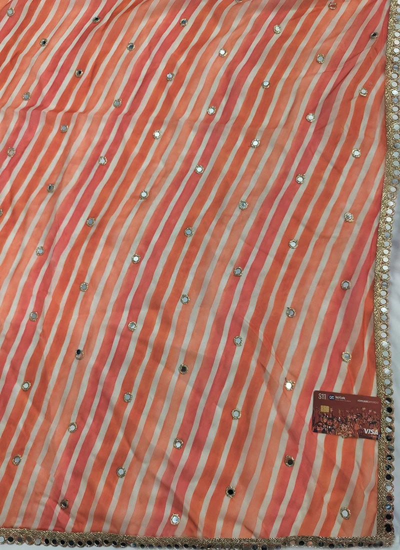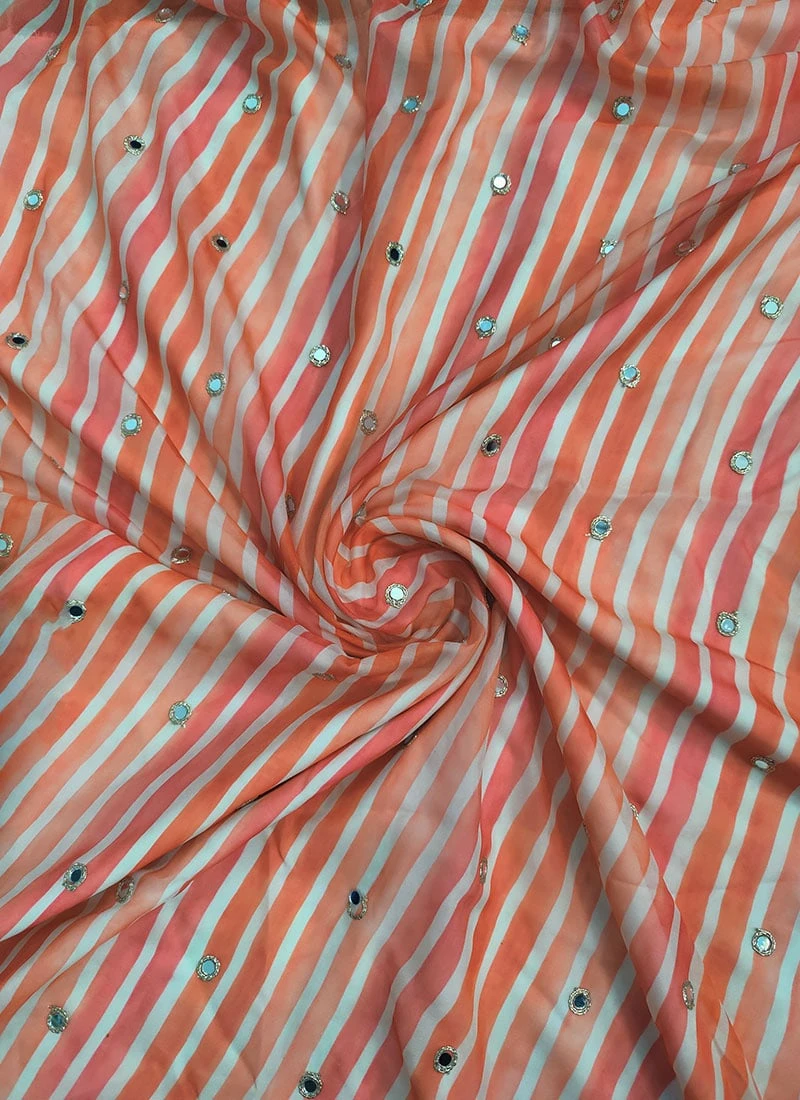 Blended Patterned Orange Art silk fabric. The digital print with mirror work gives you elegant look.