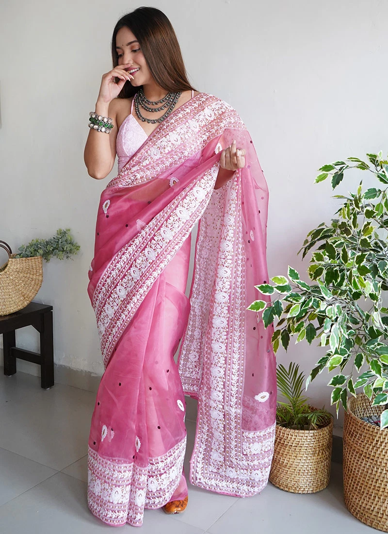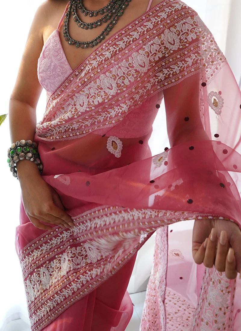 Organza Pink Color Embroidery Work Saree Party Wear