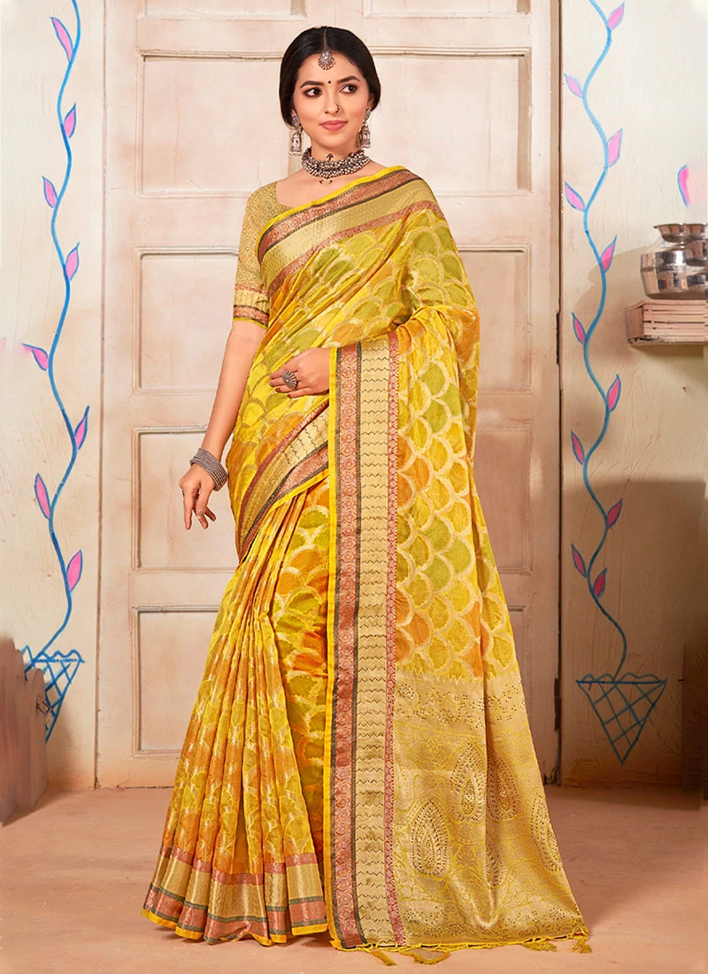 Organza Stone Work Yellow Color Saree Festive Wear