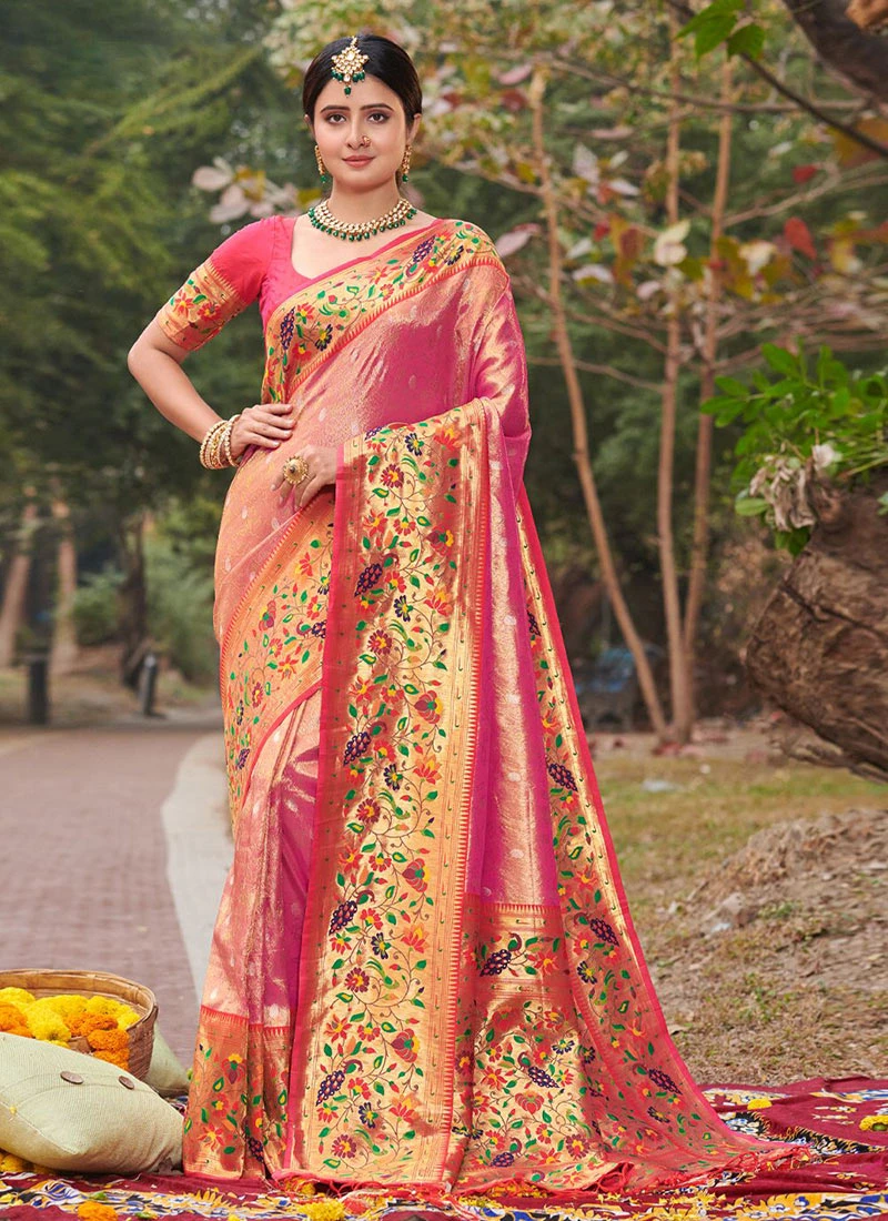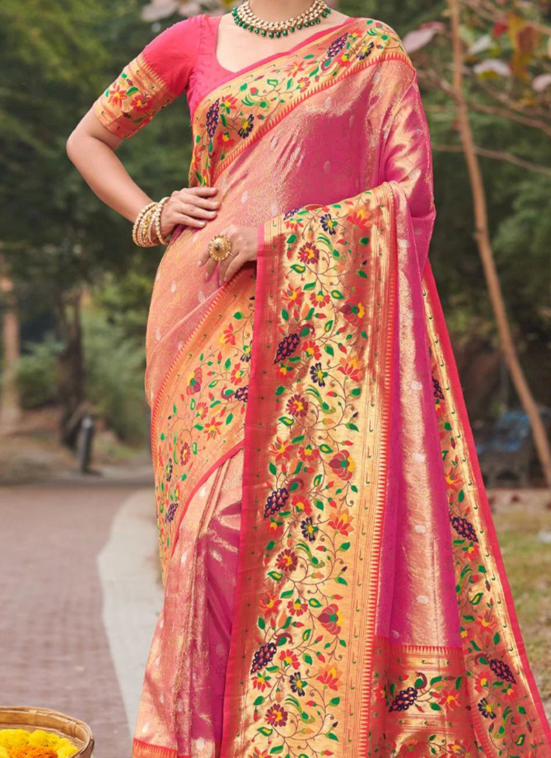 Paithani Silk Pink Color Zaru Weaving Work Saree Festive Wear