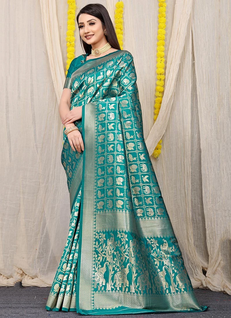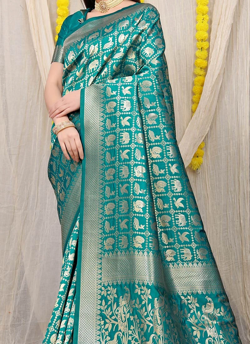 Patola Silk Zari Work Aqua Blue Color Saree Festive Wear