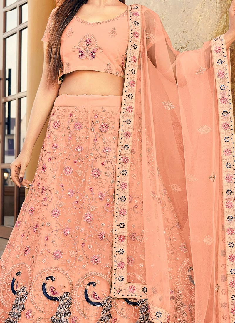 Peach Embroidery Stone Mirror Work Net A Line Lehenga Party Wear