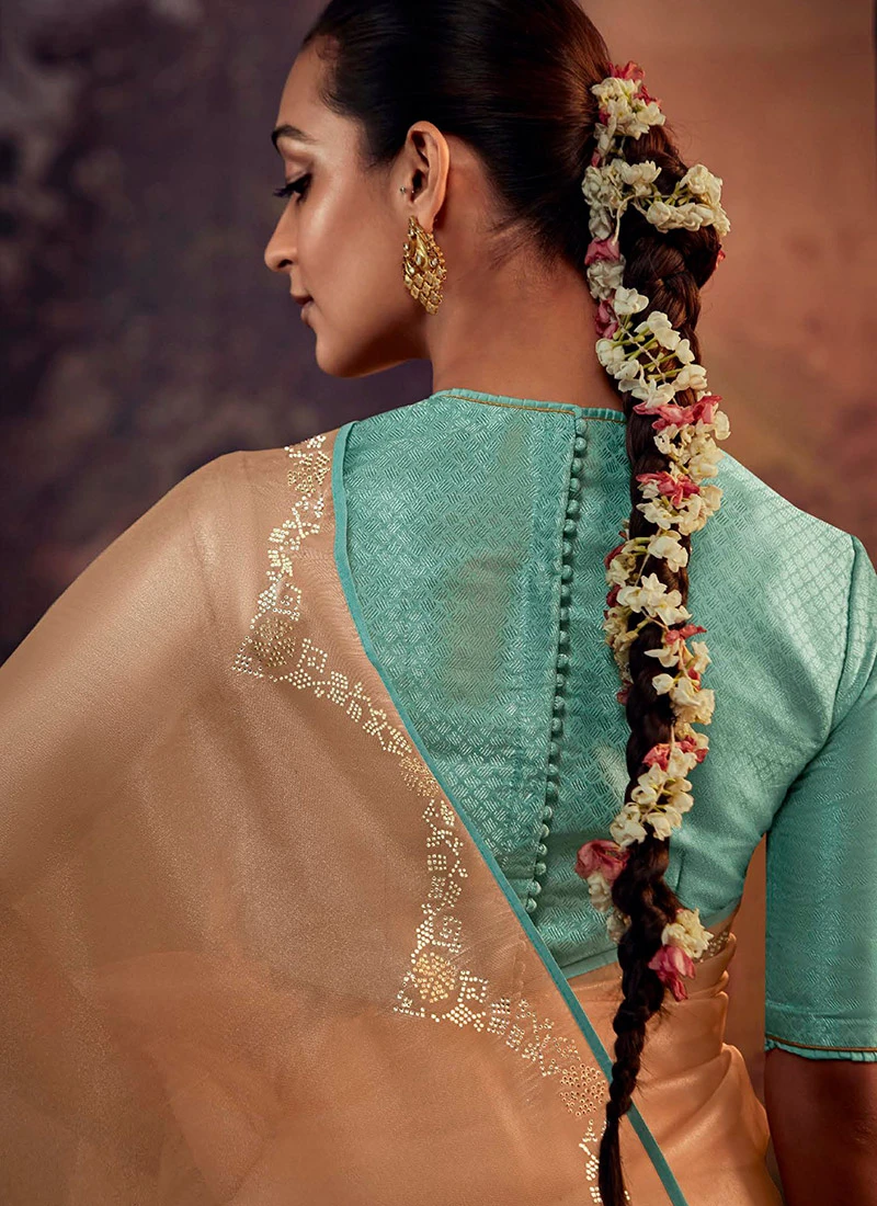 Comes with unstitched blouse fabric. To have the blouse stitched, please select the custom tailoring options. Blouses with elaborate patterns and colors are used for photo-shoot. Color and pattern of the blouse might not be as shown in the image.